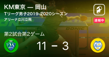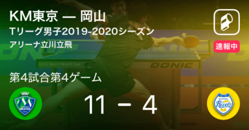 【速報中】KM東京vs岡山は、KM東京が第3試合第4ゲームを取る。アリーナ立川立飛で行われているTリーグ男子2019-2020シーズンの木下マイスター東京vs岡山リベッツの試合は、KM東京が岡山相手に第3試合第4ゲームを取ります。勝負は第4試合第4ゲームへと続きます...