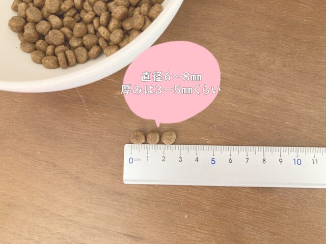 ギブルのサイズは直径約6~8㎜、厚みが約3~5㎜で小型犬種でも食べやすい小粒サイズでした。けっこうサイズがバラバラな印象です。