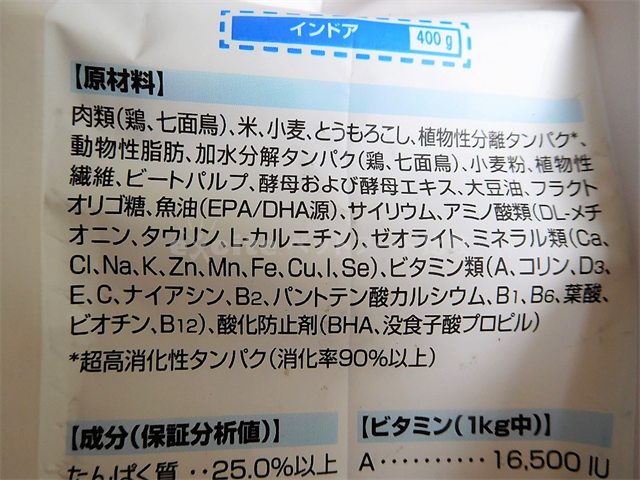 パッケージ裏側には、フードの特長や1日の給与量目安が記されてあります。原材料や成分、会社名は側面に記載されています!